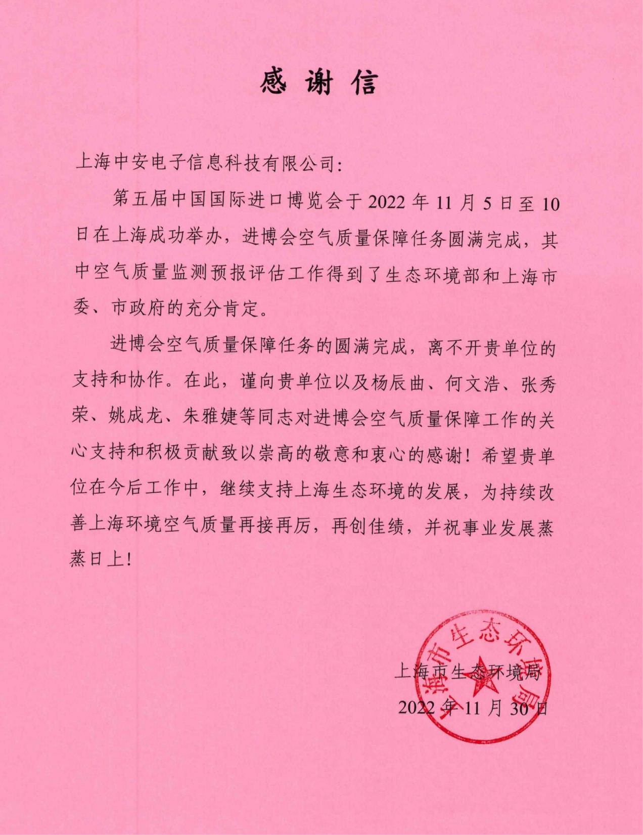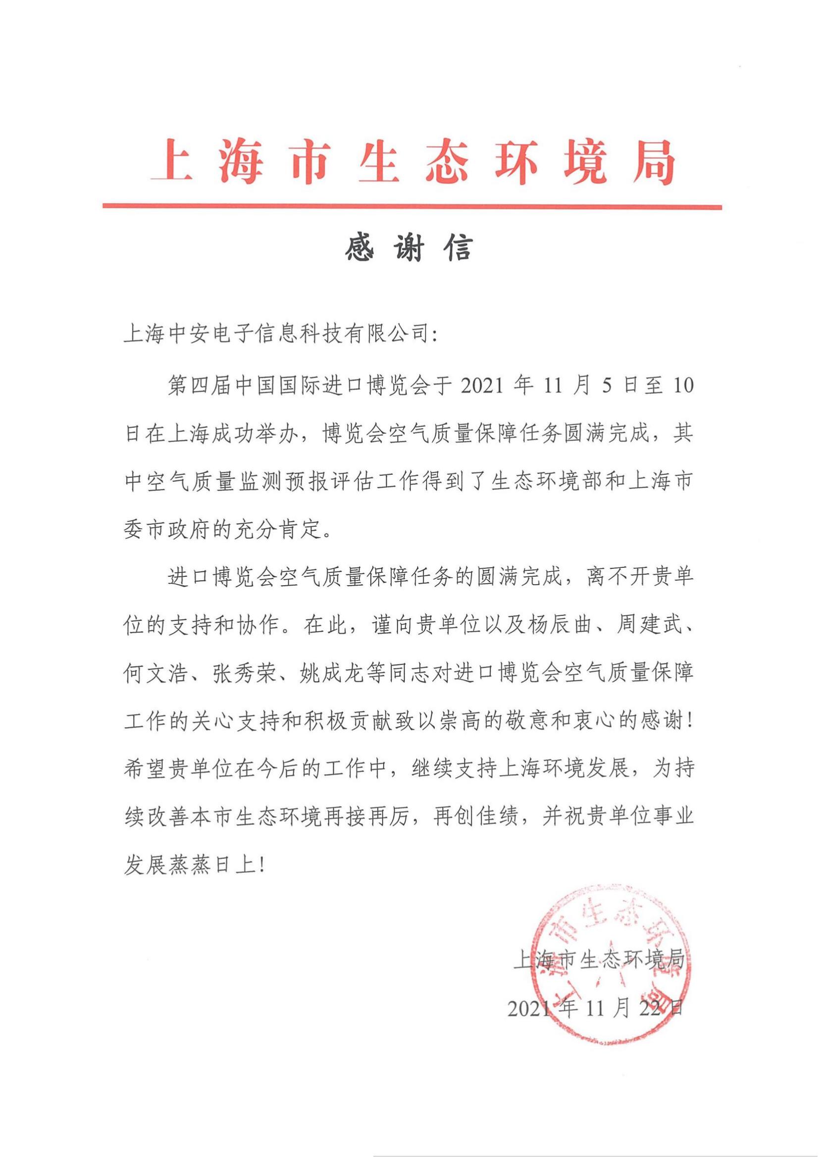 上海環(huán)監(jiān)中心就中安科技在21年國際進博會空氣質量監(jiān)測預報工作中杰出貢獻送來感謝信?。?021/12/31)